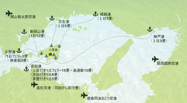 瀬戸内の各港と多くのフェリーが行き交う、アクセスしやすい島、小豆島。